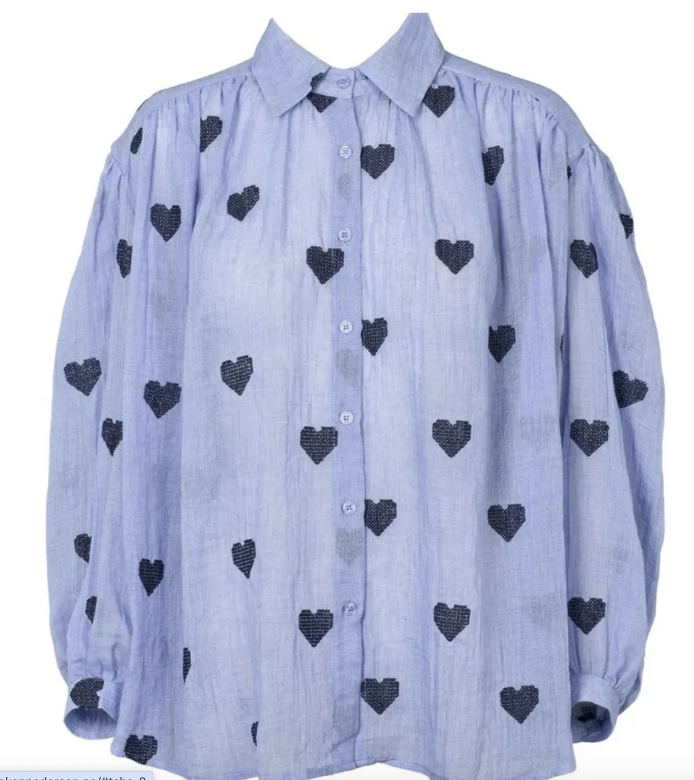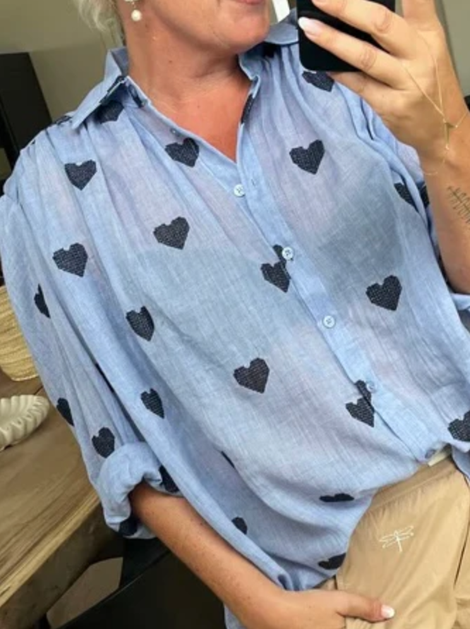 Supersøt løstsittende bluse i lett bomullskvalitet detaljert med mørkeblå broderte hjerter over det hele. Avslappet passform med klassisk skjortekrage, lange ermer og knappelukking i front.