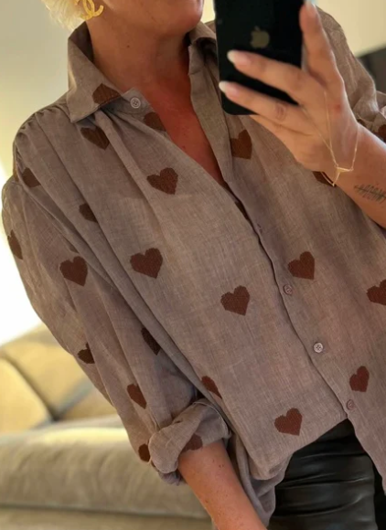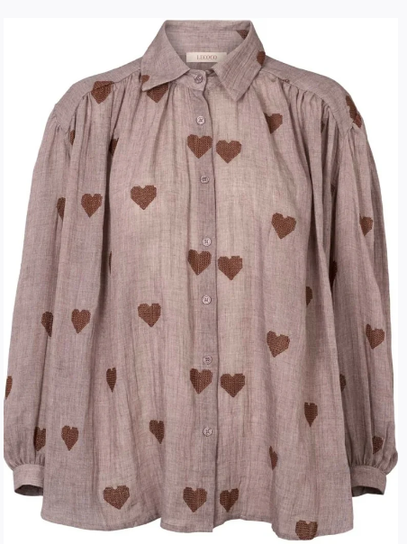 Supersøt løstsittende bluse i lett bomullskvalitet detaljert med mørkeblå broderte hjerter over det hele. Avslappet passform med klassisk skjortekrage, lange ermer og knappelukking i front.